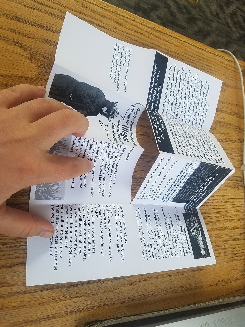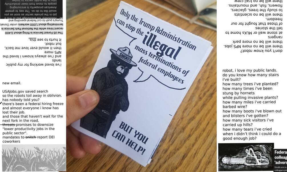Download and print this zine for free as long as you promise to spread it to friends, libraries, cafes, and anywhere they will let you leave it, and call your representatives and senators to demand they end the illegal mass termination of federal employees. Employees that are responsible for protecting our public lands, that fight wildfires, that study plants and wildlife, that preserve our history for generations, that clean bathrooms and campgrounds, that build trails. Passionate public sector employees that love their jobs and want nothing more than to continue working hard for this country.